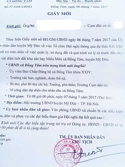 Giấy mời người dân Đồng Tâm dự cuộc công bố dự thảo kết luận thanh tra về đất đai tại sân bay Miếu Môn (Đồng Tâm, Mỹ Đức, Hà Nội). Ảnh: TP